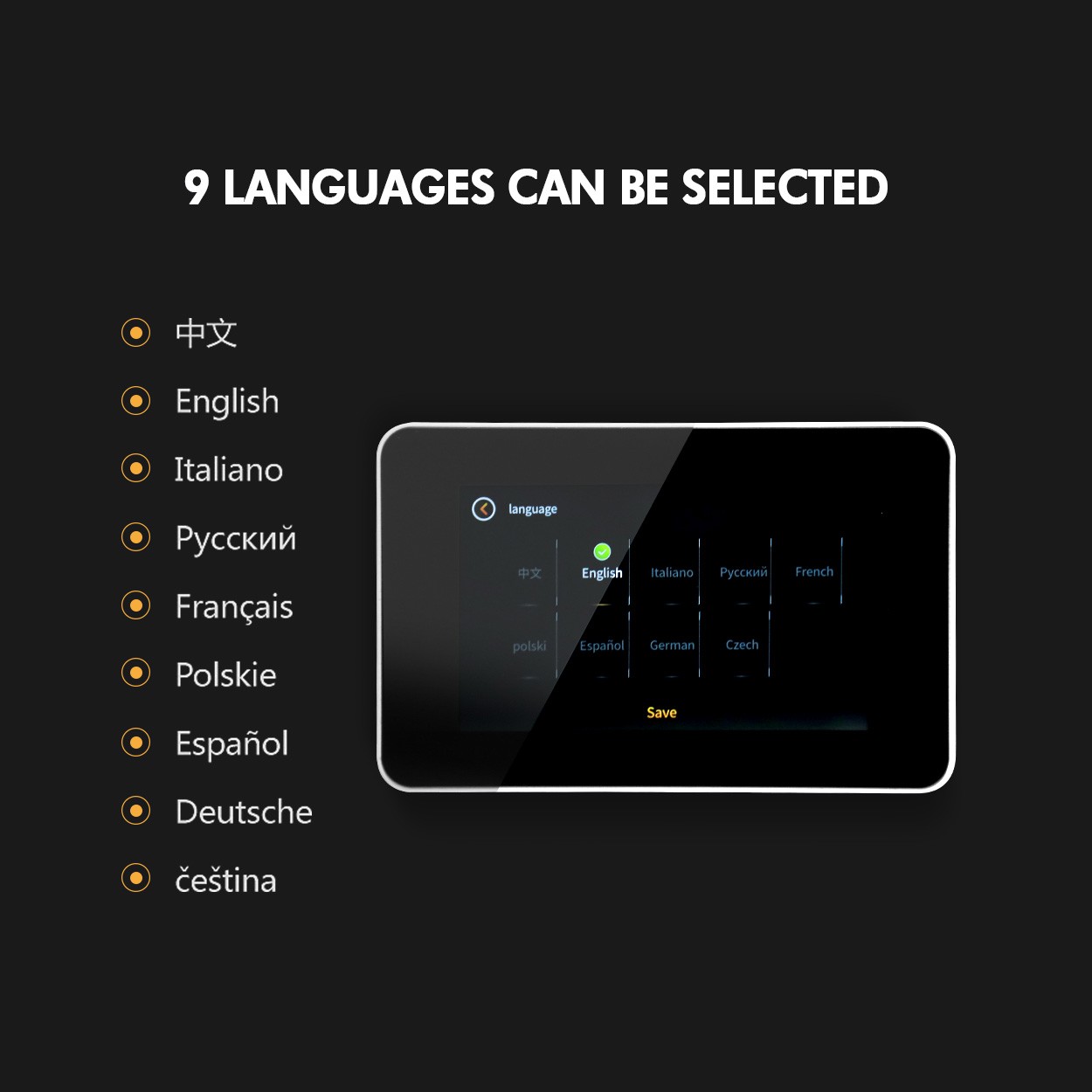 【语言设置】中文、English(英语)、ltaliano(意大利语)、Русский(俄语)、French(法语)、polski(波兰语)、Español(西班语)、German(德语)、Czech(捷克语)九国语言选择