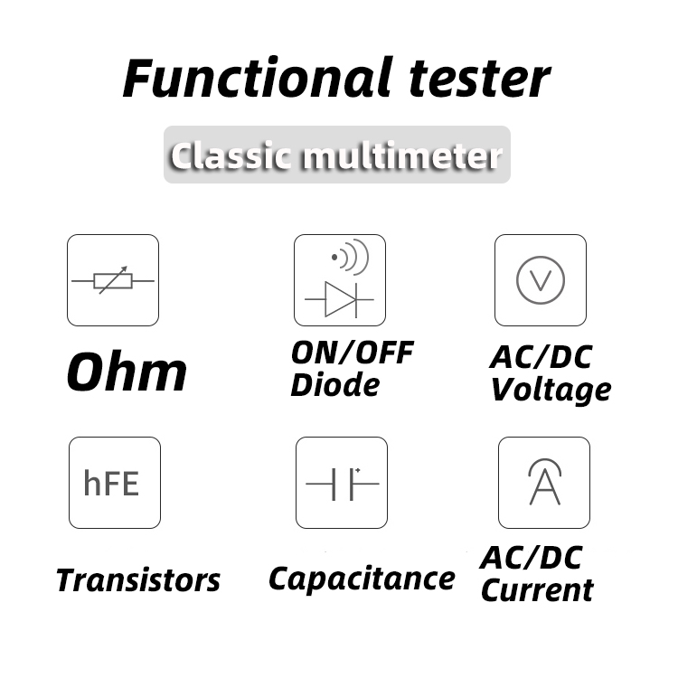 AC voltage / current, resistance, capacitance test, diode test,