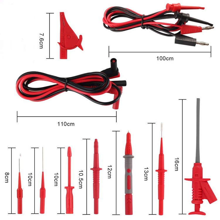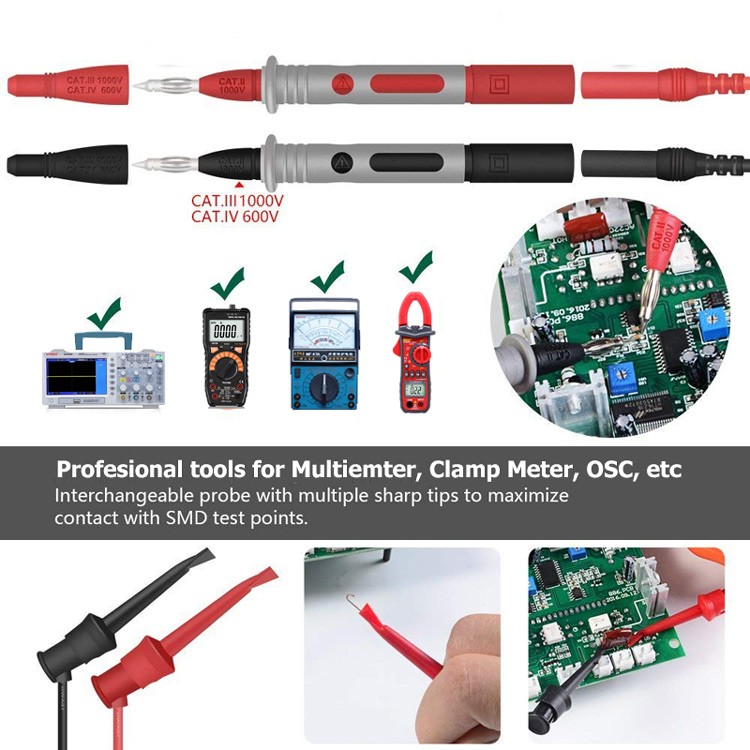 Full Insulated Safety Alligator Clips:Also include PVC test lead extensions with plugs at both ends, 4mm flexible PVC test leads, 0.7mm & 1mm sharpest test probe hook clip, perfect for tacklife multimeter and clamp meter.