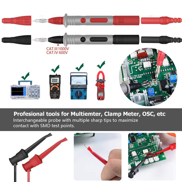 Compatible with Multimeter:They are designed for use with any multimeter, clamp meter, test instrument and so on. Removable tips, banana plugs, alligator clips and spade terminal can help expand testing capability and flexibility.