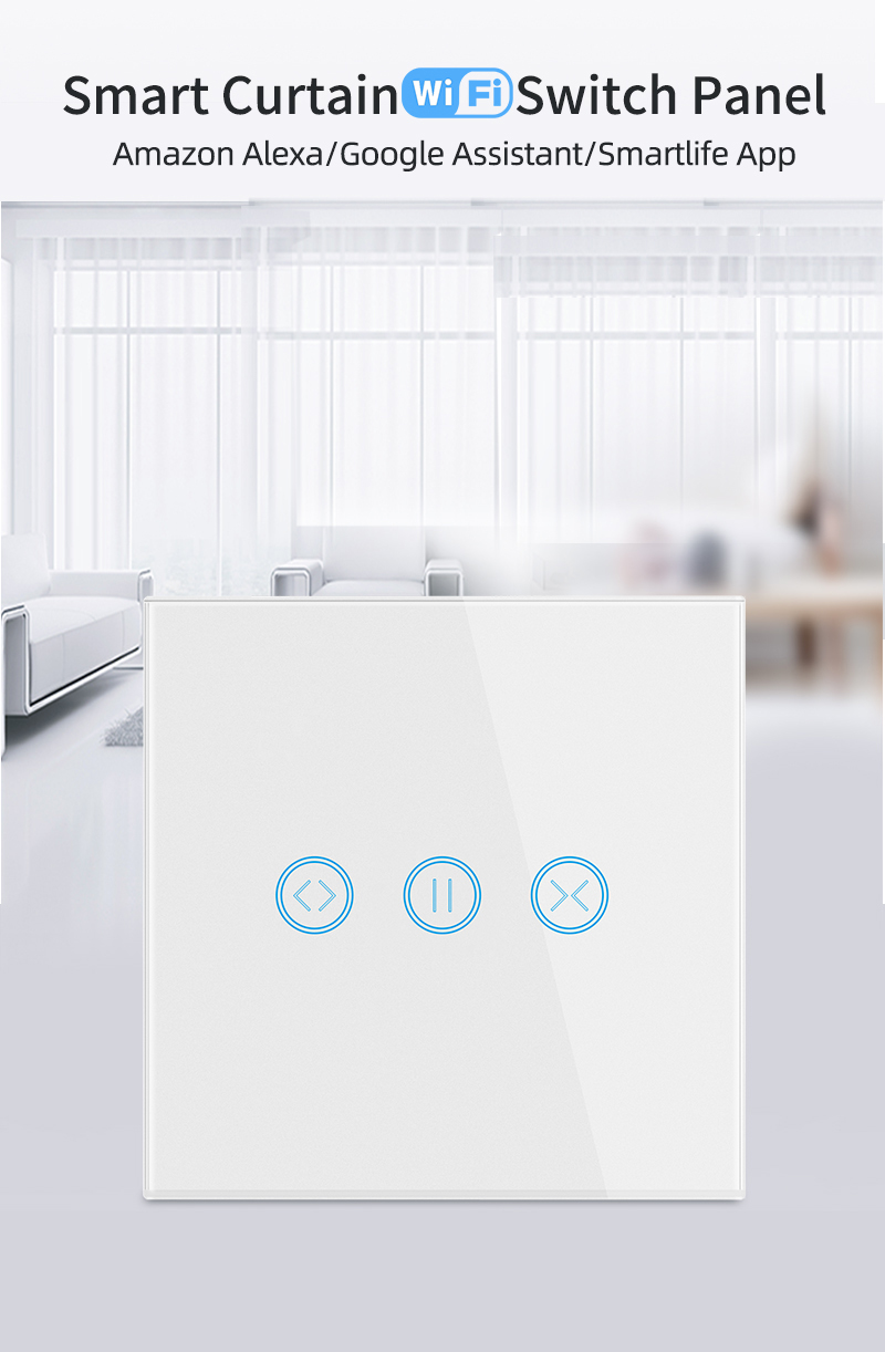 The Wi-Fi Smart Curtain Switch is able to control different kinds of curtains such as window blinds/rolling blinds/venetian blinds anytime from anywhere. 'Smart Life' APP control wirelessly via using your existing home Wi-Fi network, also touch control is available. Compatible with Alexa and Google Home, No Hub Required. Enjoy your smart life with smart products.