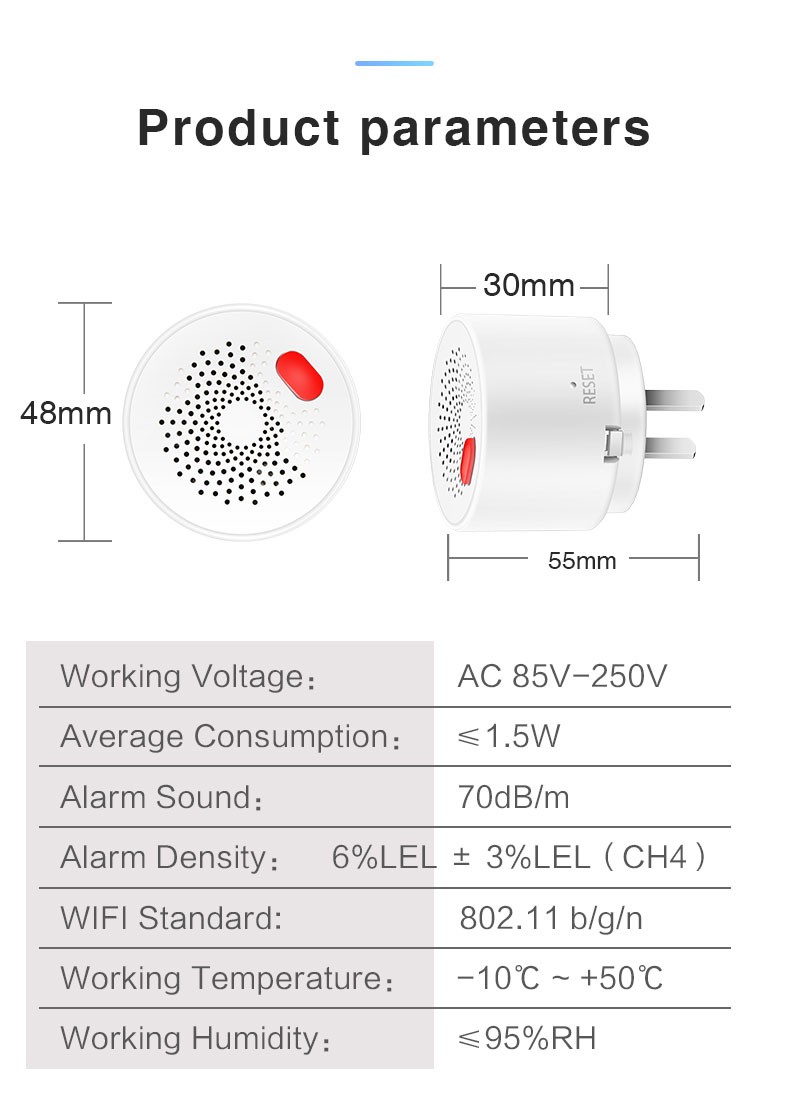WiFi combustible gas alarm is used to detect the leakage of combustible gas and prevent the hazards caused by gas leakage. The alarm uses high-stability semiconductor gas sensors, which have the characteristics of high stability and small sensitivity drift. When the gas leaks and reaches the concentration value set by the alarm, the alarm will send an alarm signal. This product is used in the kitchen and other indoor places where leakage may occur.