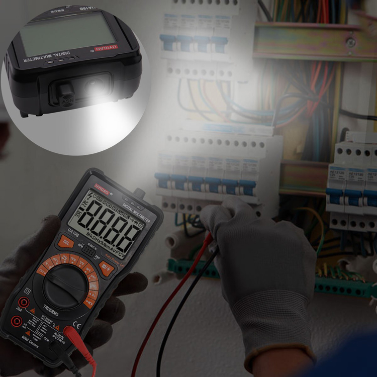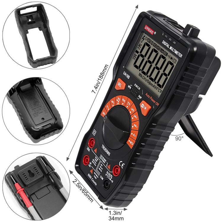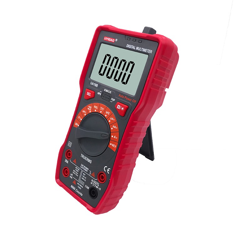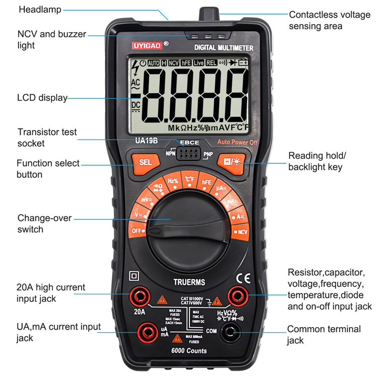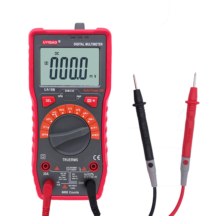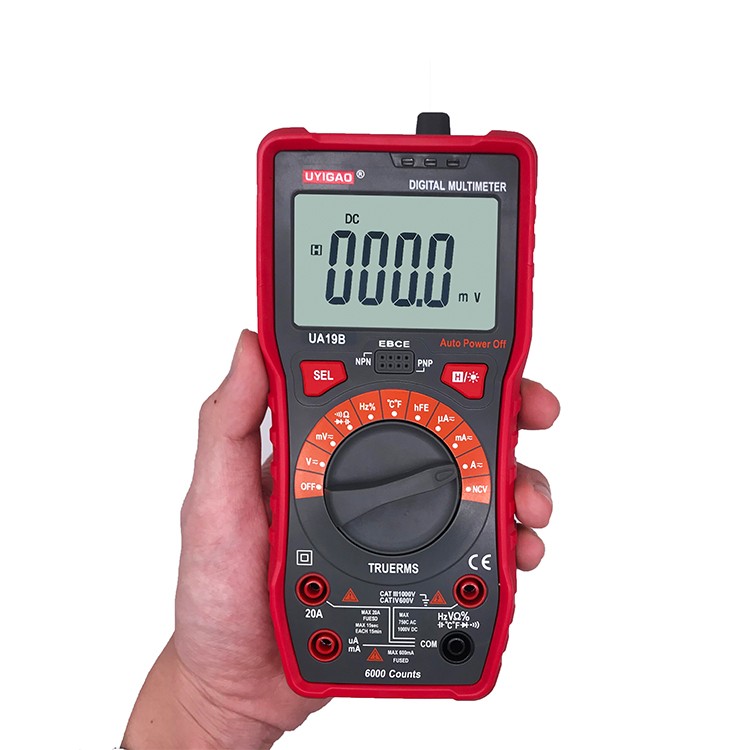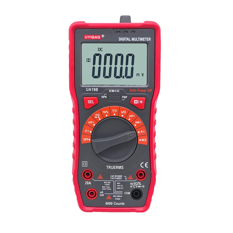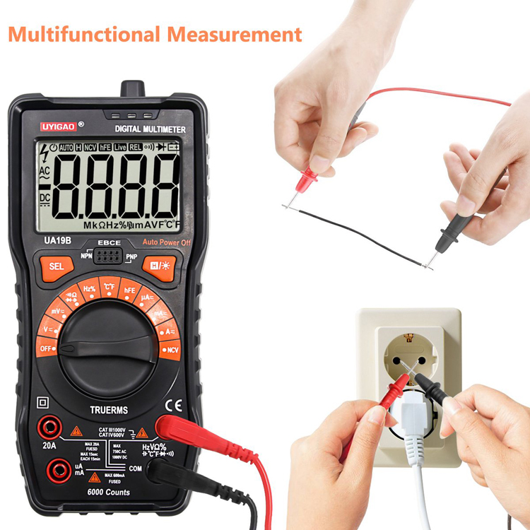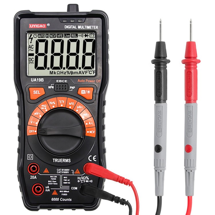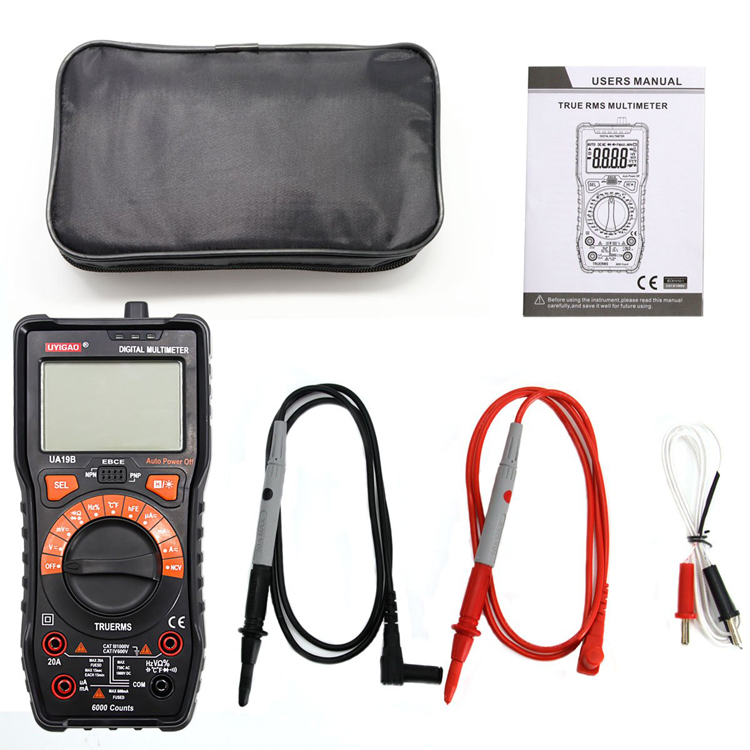 UA19BMultimeter with CAT III 1000V ,20A,NCV and True RMS with Auto range 6000 counts; DV1000V ; AC 750V;Capacitamce ;Temperature; Diode Test ;Transistor test ;Circuit On/Off Test ;Duty Ratio ;Frequency; Backlight ;Data hold