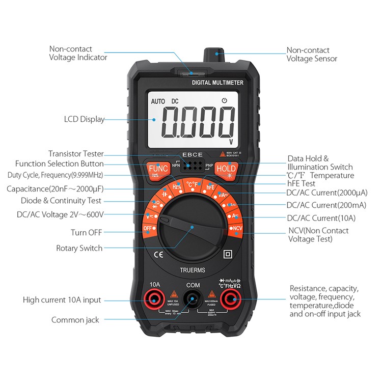 Digital Multimeter:Measuring DC/AC voltage,DC/AC current,Frequency,Duty cycle,Diode,on-off test,Temperature measurement ect.