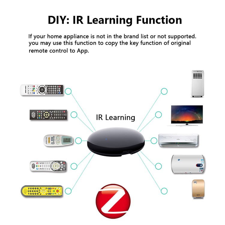 With this Universal IR Remote Control, you may use your smart phone to control home appliances, such as STB(Set-Top-Box), TV Box, TV, Air Conditioner, Fan, DVD, etc. Compatible with most of brands, for details, please refer to the supported brand list in App. Besides, it has LEARNING FUNCTON, allows you to copy the key function of original remote control to App.