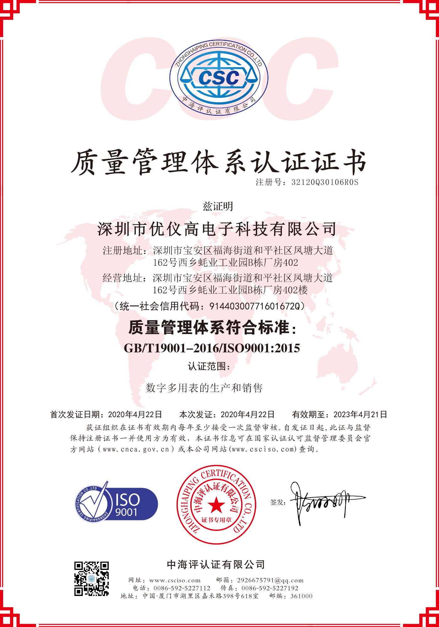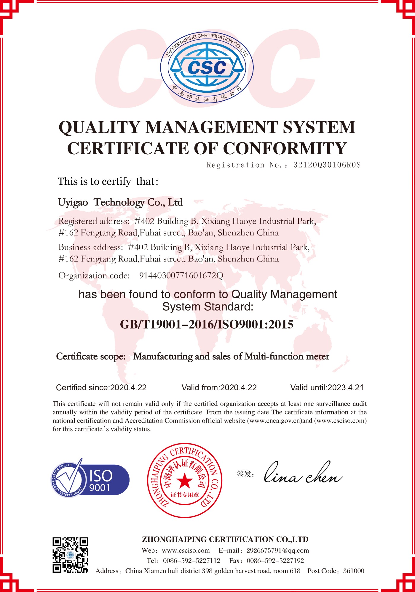 The ISO 9001 Quality System, covering all phases of UYIGAO activities, was originally certified by CSC in 2005.